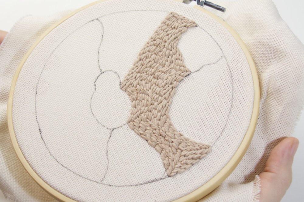 Posledním tipem jak ozvláštnit motiv je vytvořit jakési liány. Jde o dlouhé smyčky, kdy jsem jehlu zapíchla na jednom místě, manuálně přízi potáhla, a jehlu poté zapíchla těsně vedle prvního místa vpichu. Toto jsem několikrát zopakovala. Nakonec jsem smyčky rozstřihla napůl.